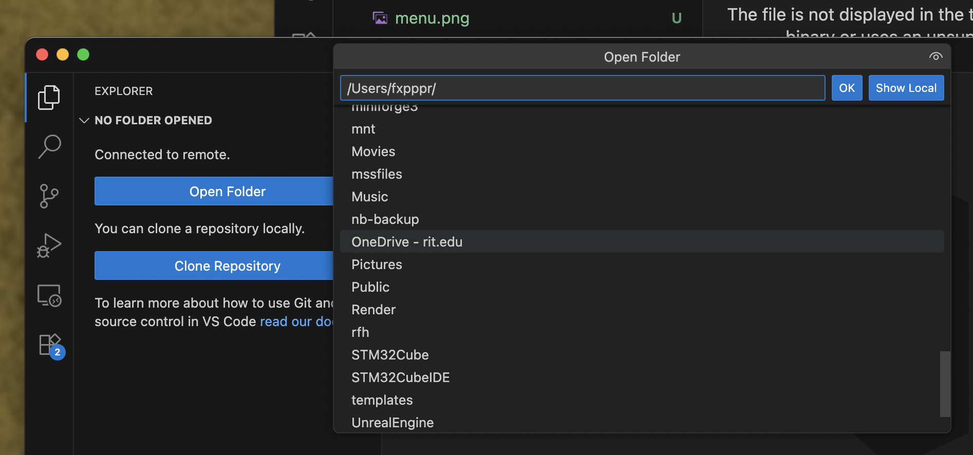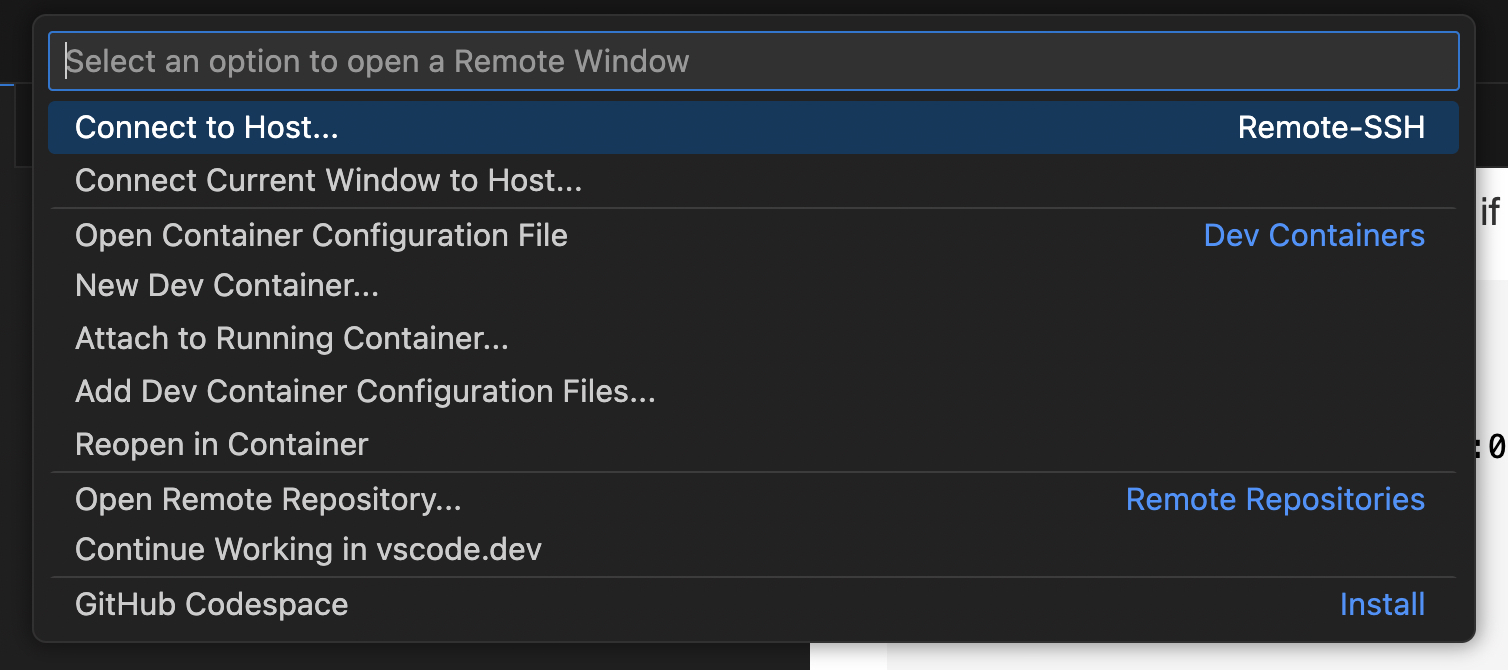 and when you click on the lower-left corner of VS Code, the remote-access panel —