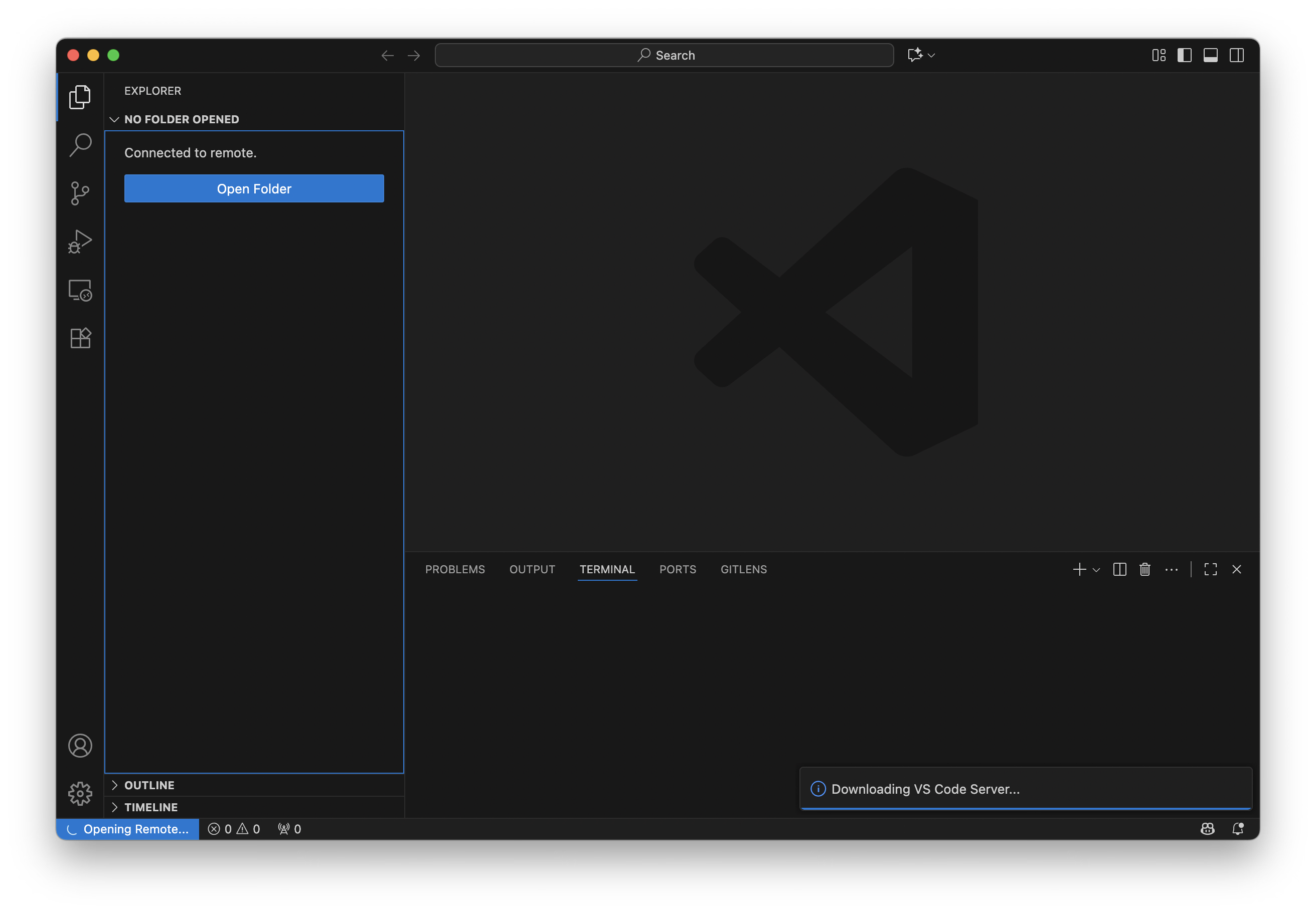Once it starts connecting you’ll notice that the lower-blue bar will give you a status update, and a dialog box on the lower right will let you know about the status of loading the Visual Studio Code Server on the remote machine.