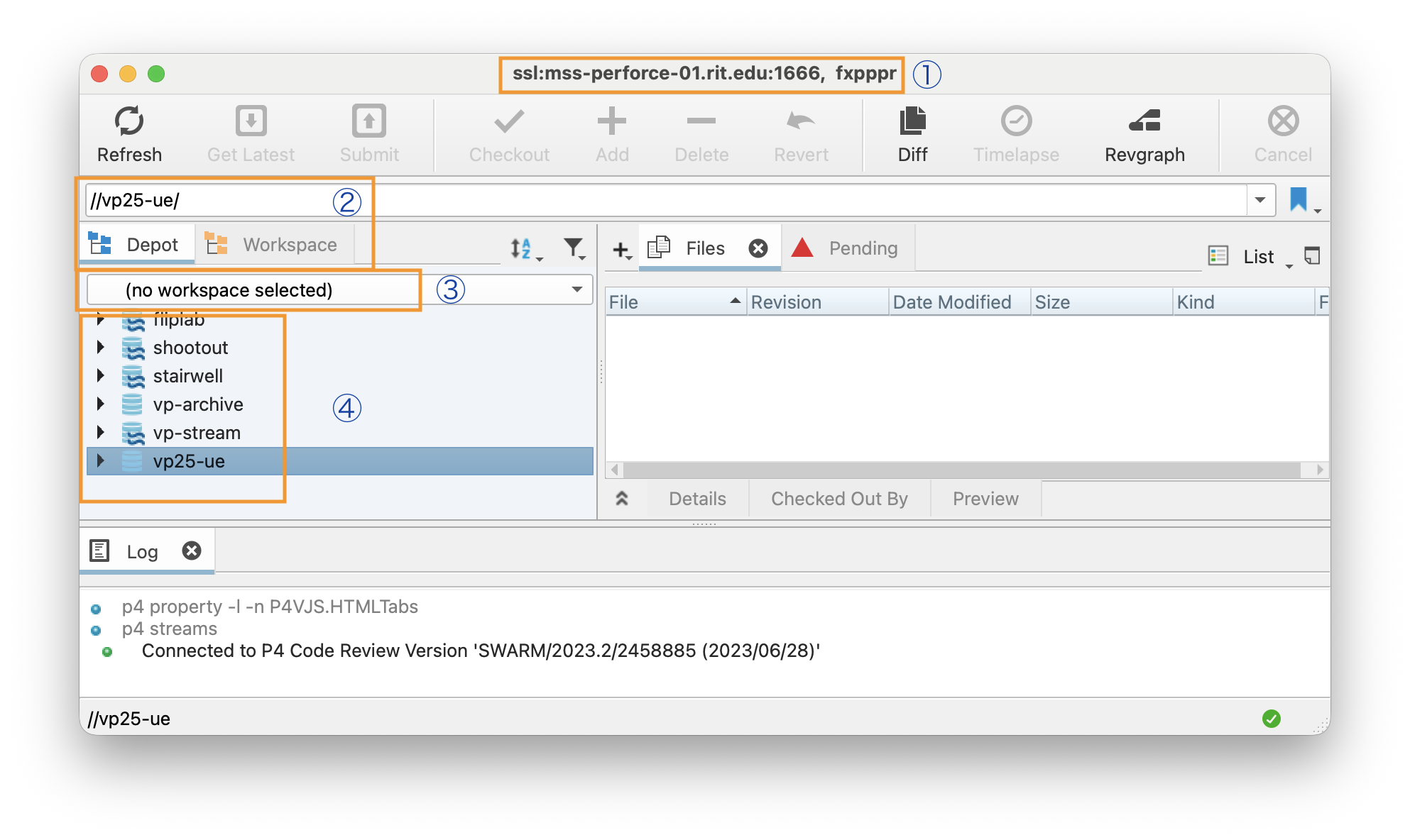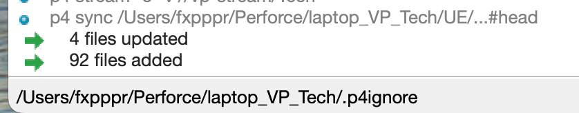 Once you’ve synced your files, you’re ready to start working. Remember, the workspace files are stored in a directory on your machine, here, for me, a subdirectory of /Users/fxpppr/Perforce