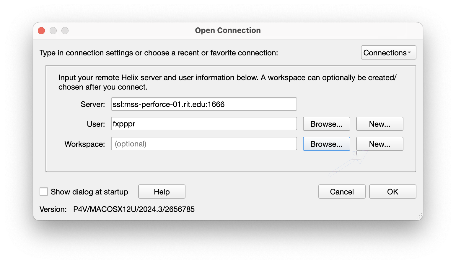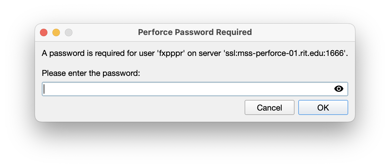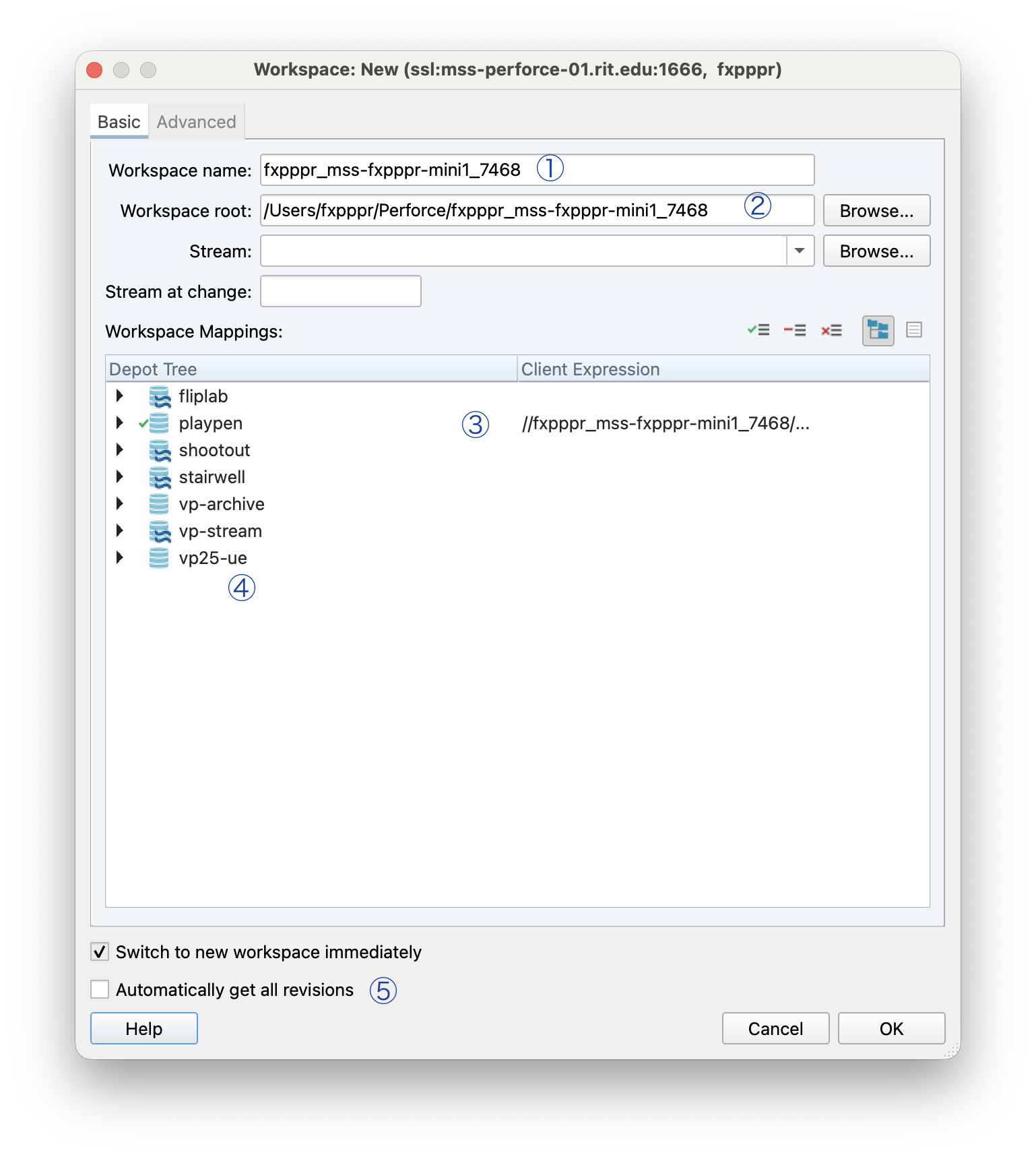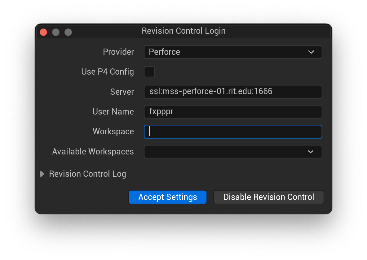 You’ll be asked for your Perforce credentials here and to select a workspace to associate with the project. You should select the workspace you set up earlier. You might have to log in to get the popup list of available workspaces to appear.